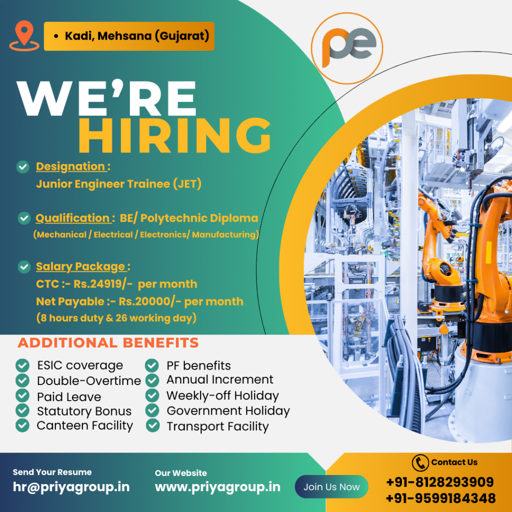 β€’ Polytechnic Diploma Engineers/BE (Mechanical / Electrical / Electronics/ Manufacturing & any engineering trade) with CTC Salary Rs.24919/- for duty 8 hrs (Rs.20000/- Net Pay) + additional benefits